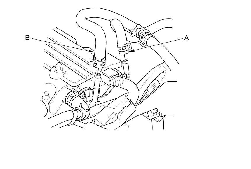 58. Connect the EVAP canister hose (A) and the brake booster vacuum hose (B).