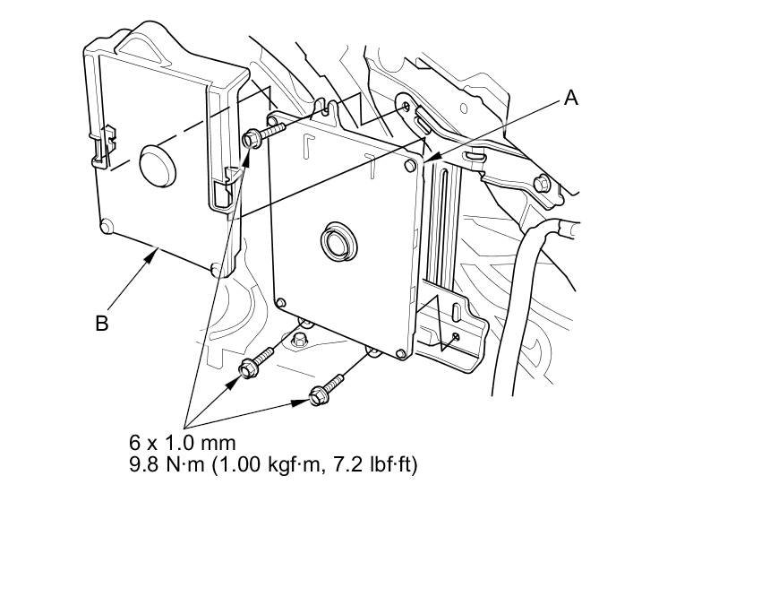 61. Install the ECM/PCM (A), then install the ECM/PCM cover (B).