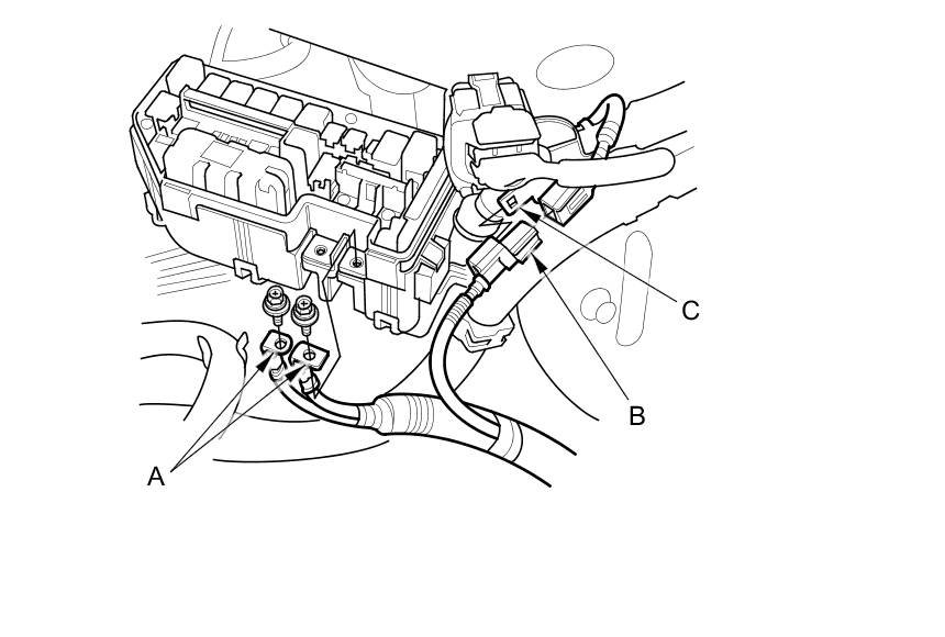 63. Connect the harness connector (B), and install the harness connector to the bracket (C).