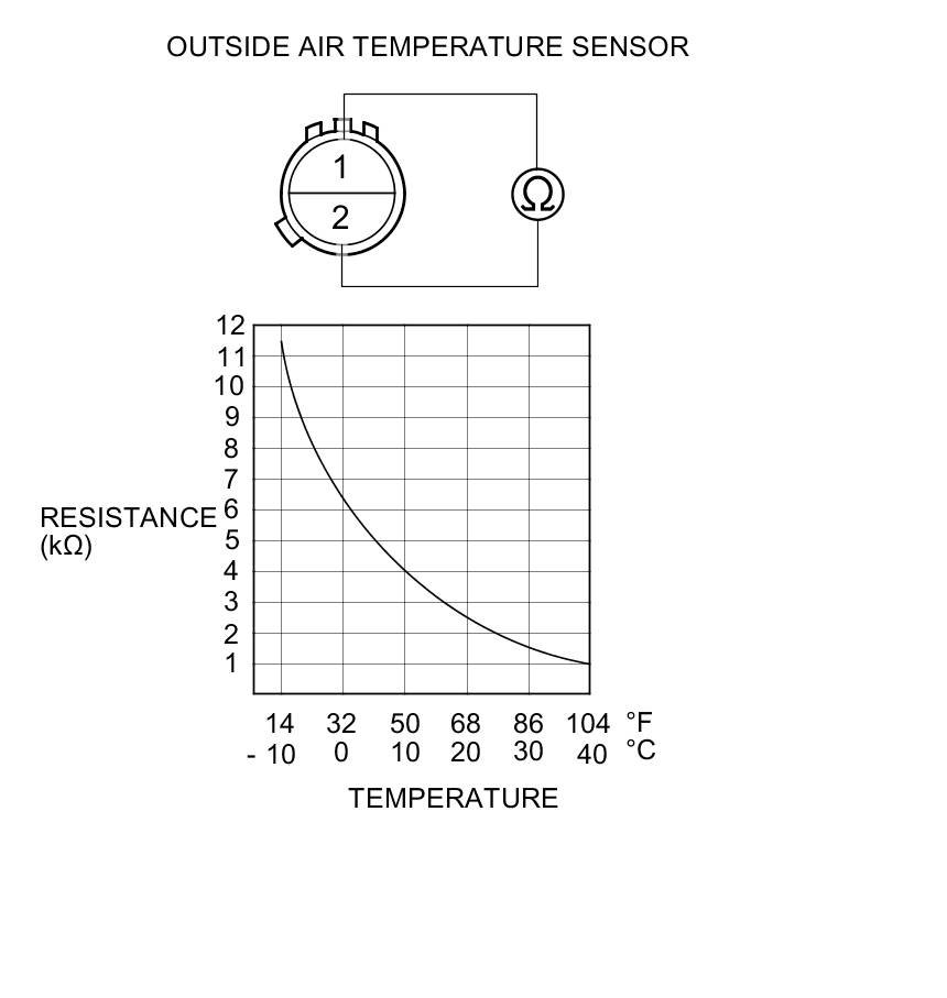 3. Compare the resistance reading between terminals No. 1 and No. 2 of the outside air temperature sensor with the specifications shown in the graph; the resistance should be within the specifications.