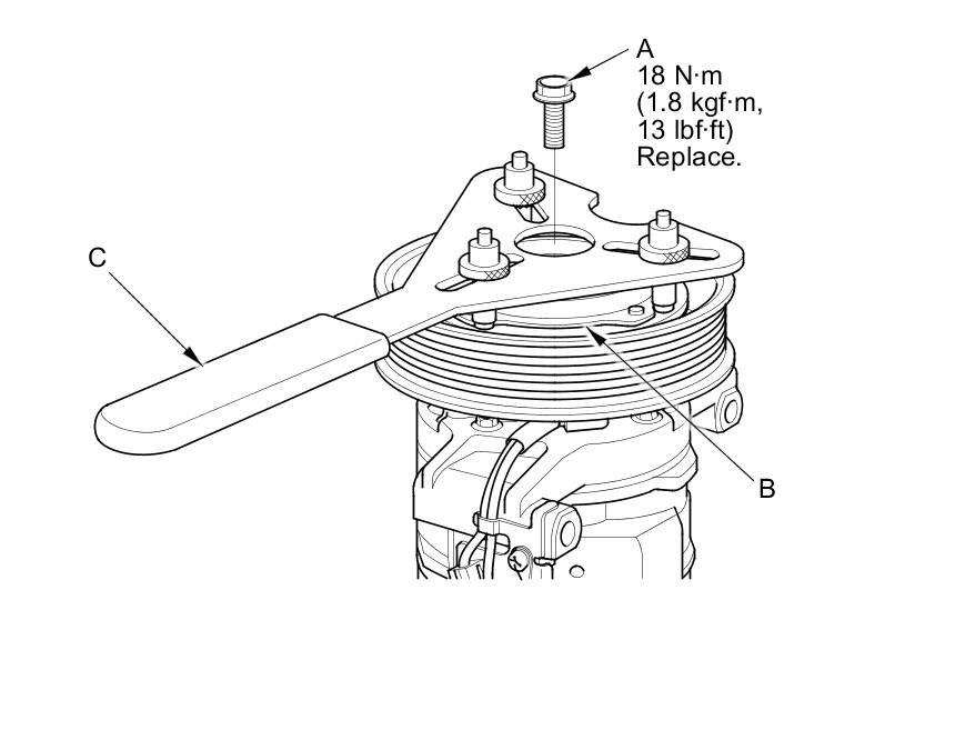 1. Remove the center bolt (A) while holding the pressure plate (B) with the A/C clutch holder (C).