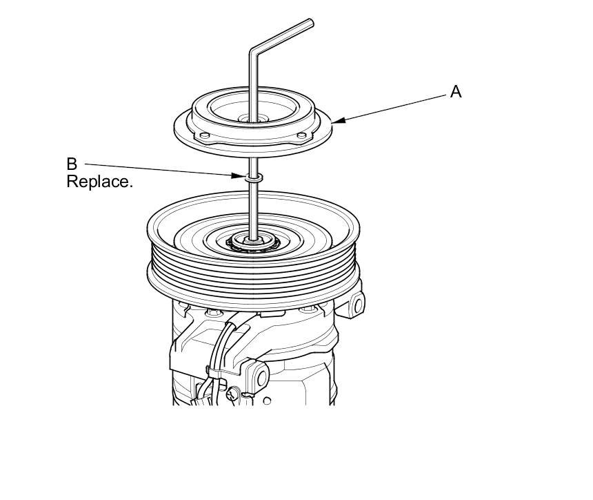 - When replacing the clutch set, place a trial stack of shims, 1 mm total thickness, on the A/C compressor shaft. Install the pressure plate, and check its clearance Testing and Inspection. If the clearance is not within specification, add or subtract shims as needed.