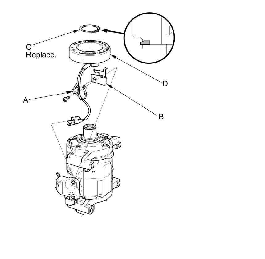 4. Remove the screw, the harness clip (A), and the holder (B). Remove the snap ring (C) with snap ring pliers, then remove the field coil (D). Be careful not to damage the field coil or the A/C compressor.