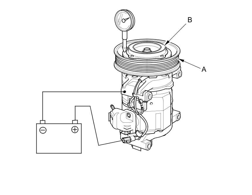3. Measure the clearance between the pulley (A) and the pressure plate (B) with a dial indicator. Zero out the indicator, then apply battery voltage to the A/C compressor clutch. Measure the movement of the pressure plate when the voltage is applied. If the clearance is not within the specified limits, the pressure plate must be reshimmed Service and Repair.