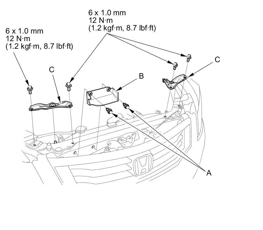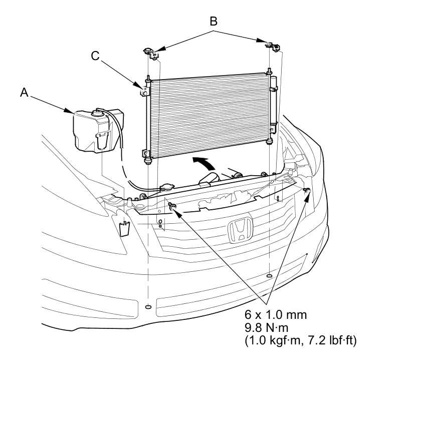 8. Remove the bolts, then remove the A/C condenser upper mount brackets (B). Remove the A/C condenser (C) by lifting it up. Be careful not to damage the radiator or A/C condenser fins when removing the A/C condenser.