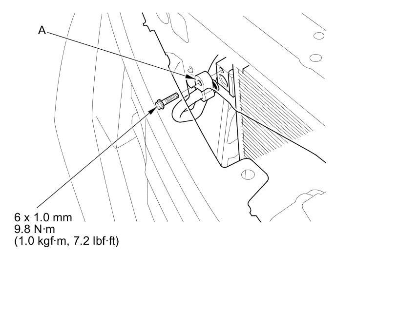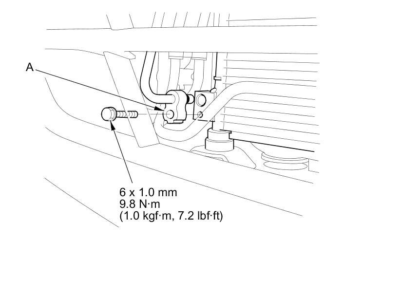 6. Remove the bolt, then disconnect the discharge hose (A) from the A/C condenser.