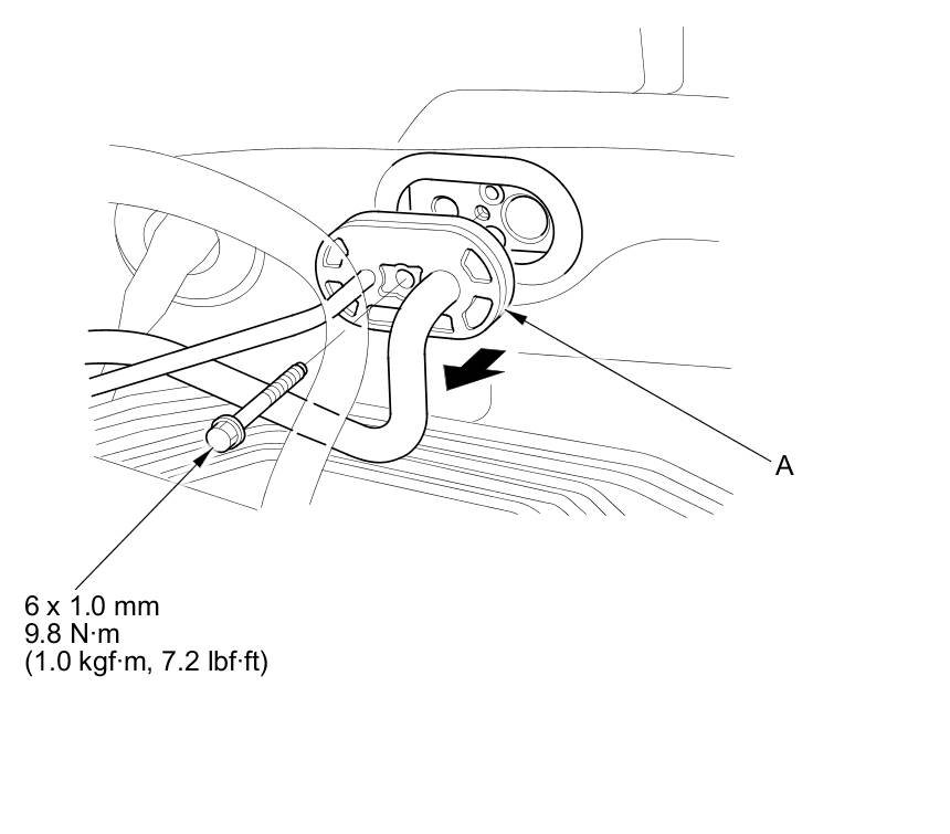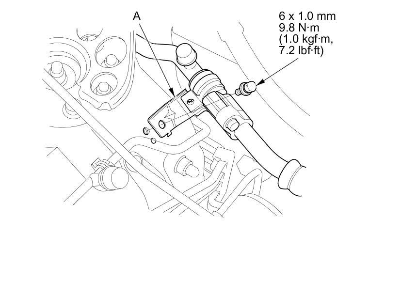 2. Remove the bolt from the A/C line clamp (A).