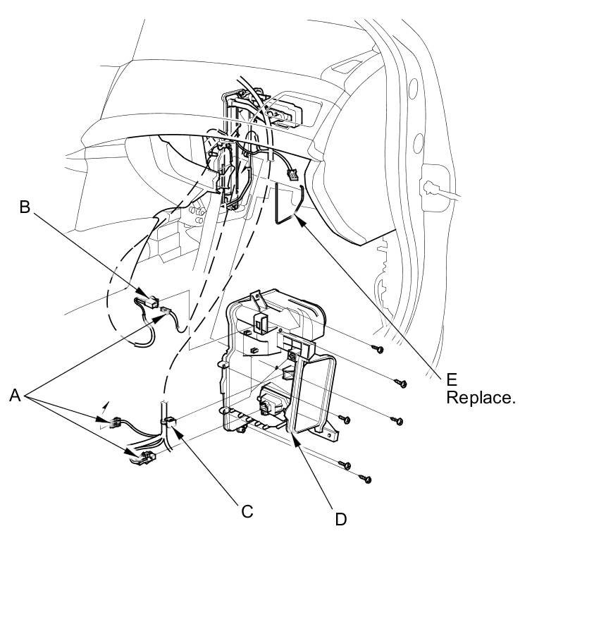 6. Disconnect these connectors (A): The evaporator temperature sensor, the power transistor, and the passenger's air mix control motor (with climate control). Detach the connector clip (B) and the harness clip (C). Remove the self-tapping screws, the expansion valve cover (D), and the seal (E).