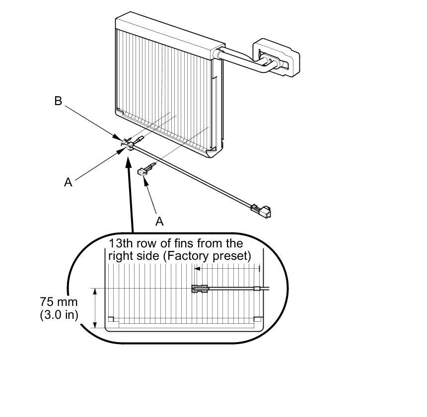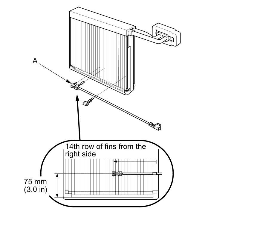 9. When the evaporator temperature sensor (A) is reinstalled onto a new evaporator core, set the evaporator temperature sensor in the 13th fin from the right side.