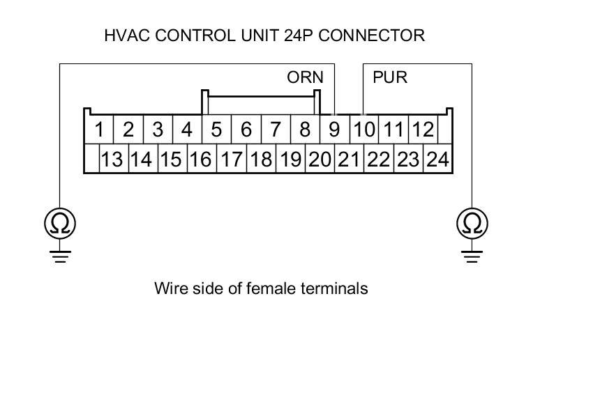 8. Check for continuity between body ground and HVAC control unit 24P connector terminals No. 9 and No. 10 individually.