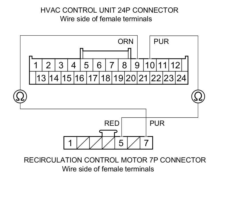 Check for loose wires or poor connections at the HVAC control unit 24P connector, and at the recirculation control motor 7P connector. If the connections are good, substitute a known-good HVAC control unit, and recheck. If the symptom/indication goes away, replace the original HVAC control unit HVAC Control Unit Removal/Installation.