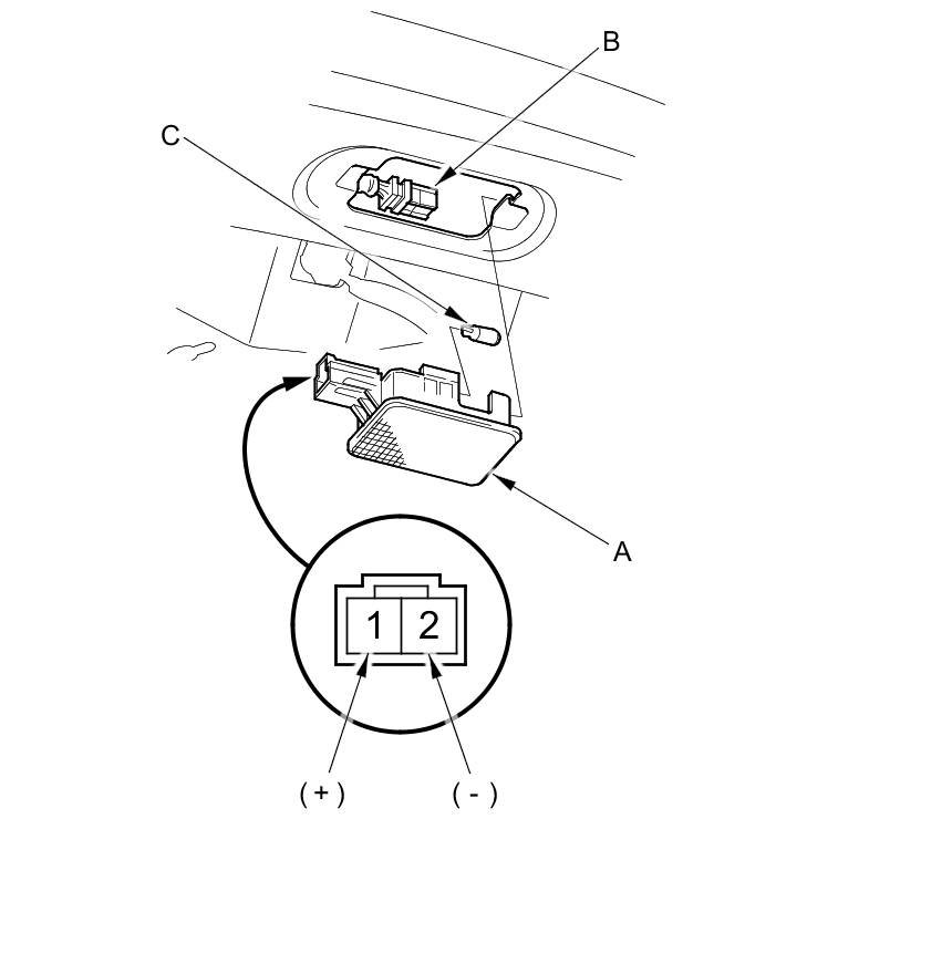 4. Check for continuity between terminals No. 1 (+) and No. 2 (-). There should be continuity. If there is no continuity, check the bulb (C). If the bulb is OK; replace the trunk light assembly.