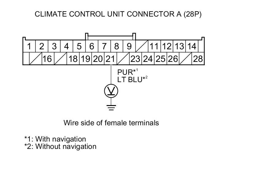7. Measure the voltage between climate control unit connector A (28P) terminal No. 21 and body ground.