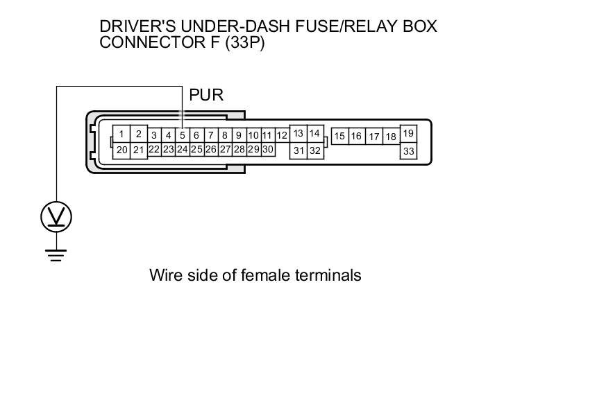 8. Measure the voltage between driver's under-dash fuse/relay box connector F (33P) terminal No. 5 and body ground.