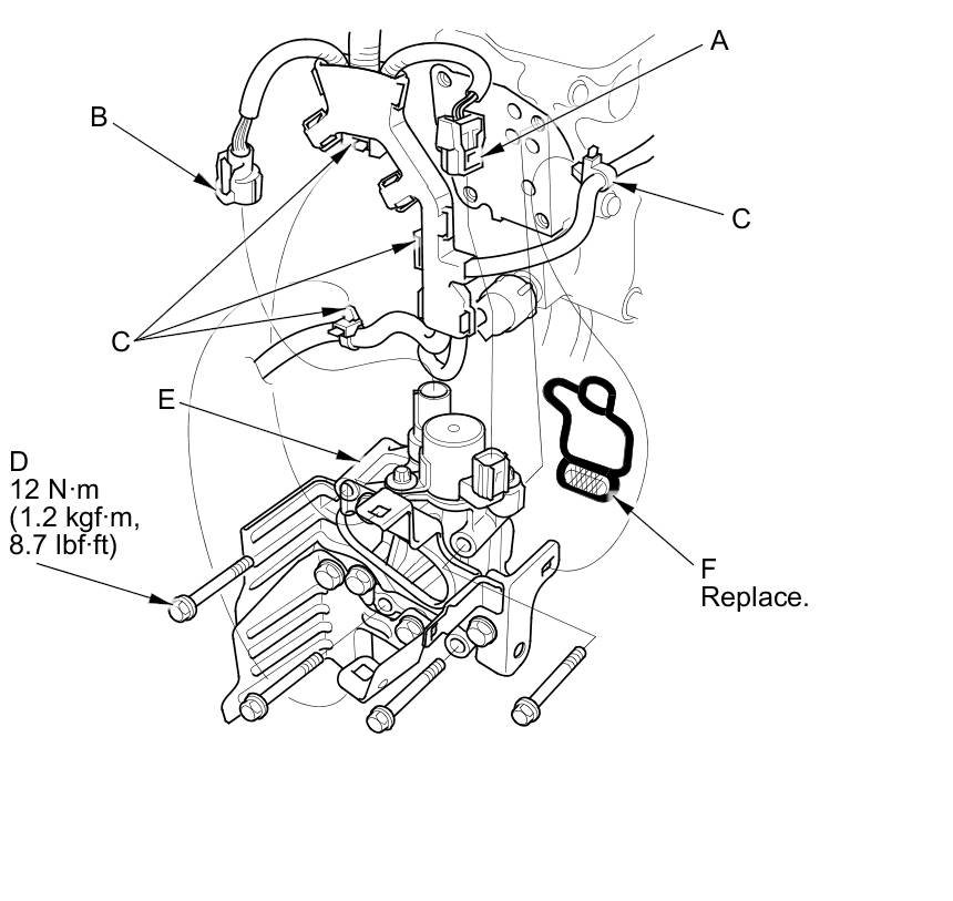 4. Remove the rocker arm oil control valve assembly (E) and the rocker arm oil control valve filter (F).