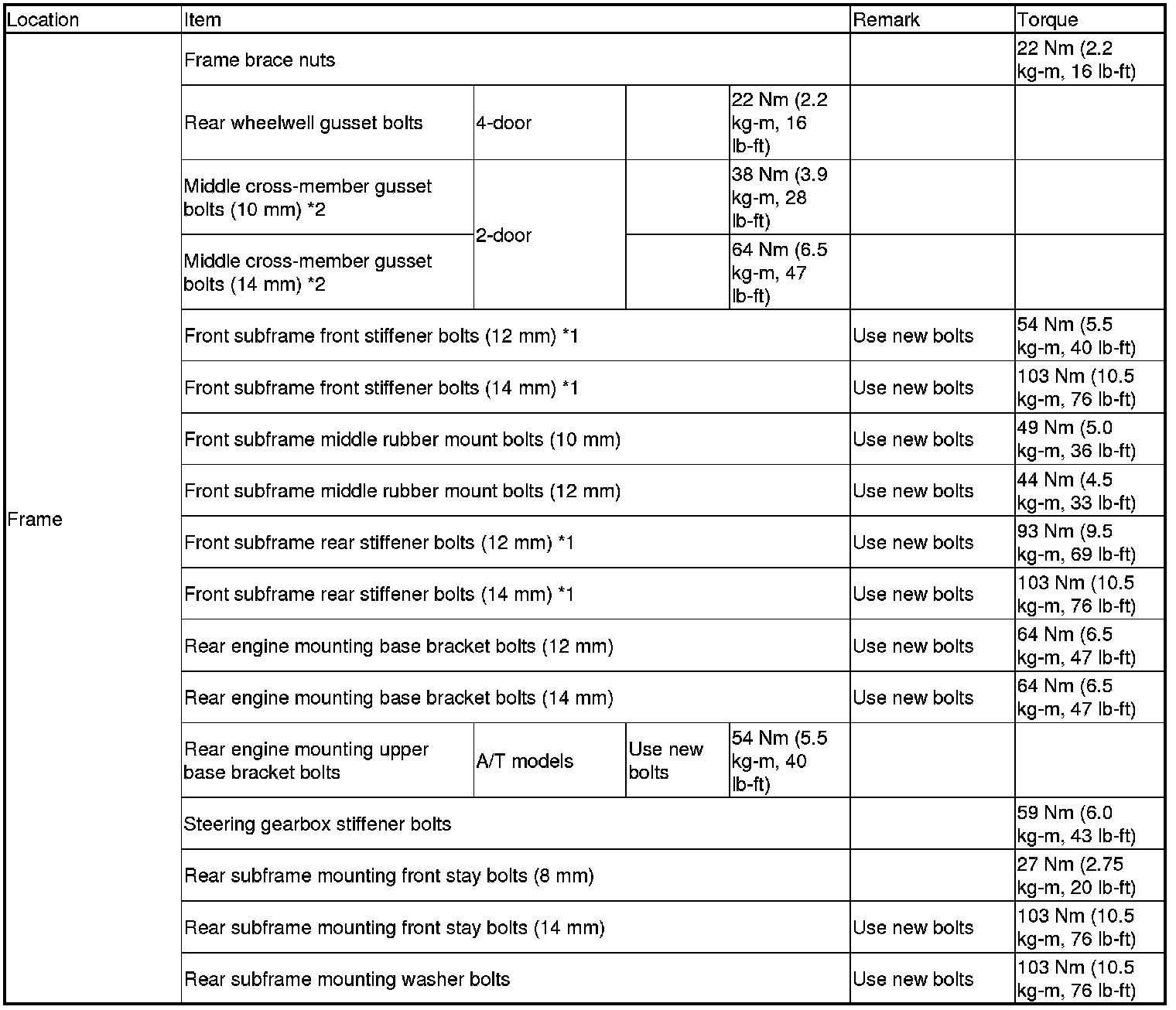 *Refer to each S/M section for the bolts/nuts not indicated here.