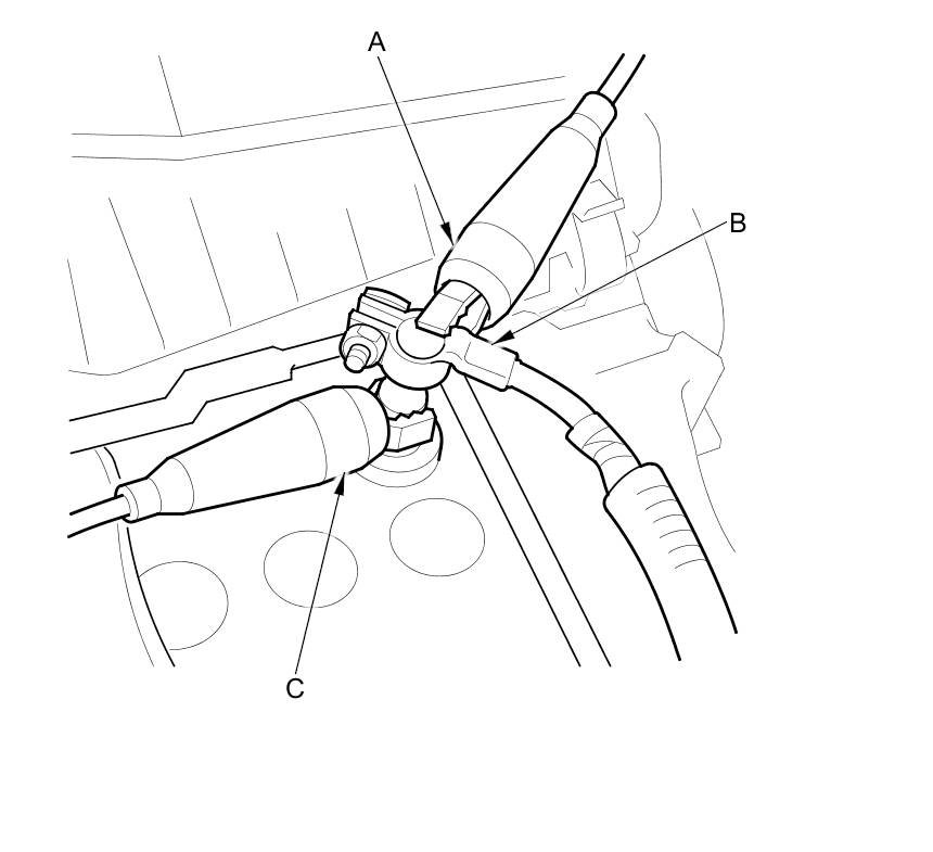 15. Carefully slide the negative terminal of the battery ground cable upwards from the battery negative terminal post to maintain contact and avoid disconnection. Then connect the black (-) test lead (C) to the battery negative terminal post.