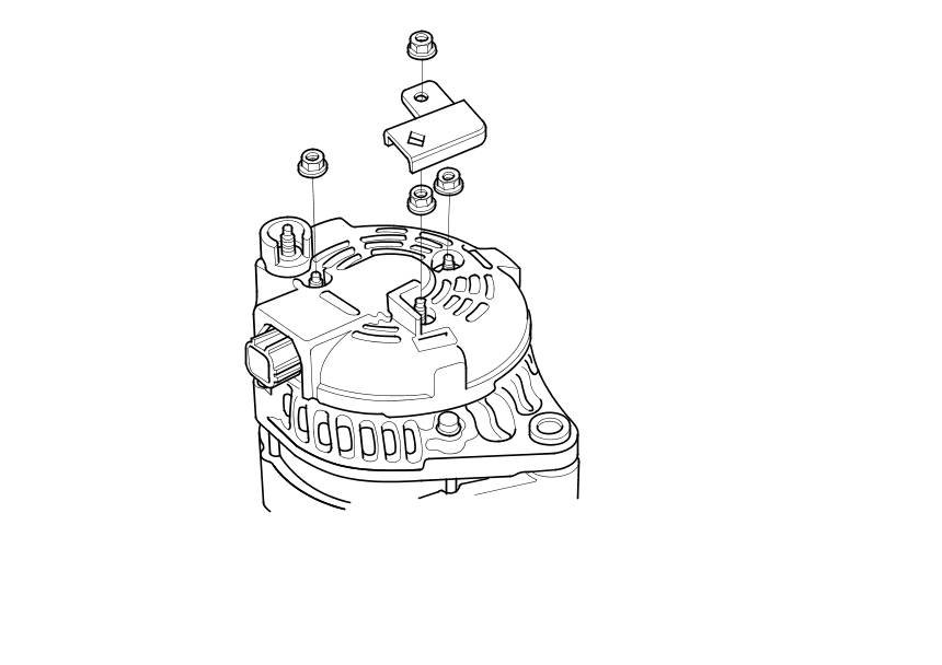 4. Remove the harness stay and the three flange nuts from the alternator.
