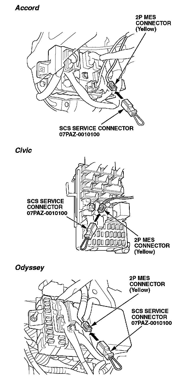 15. Watch the SRS indicator. (It comes on for about 6 seconds and then goes off.) Unplug the SCS service connector from the 2P MES connector within 4 seconds after the indicator goes off.