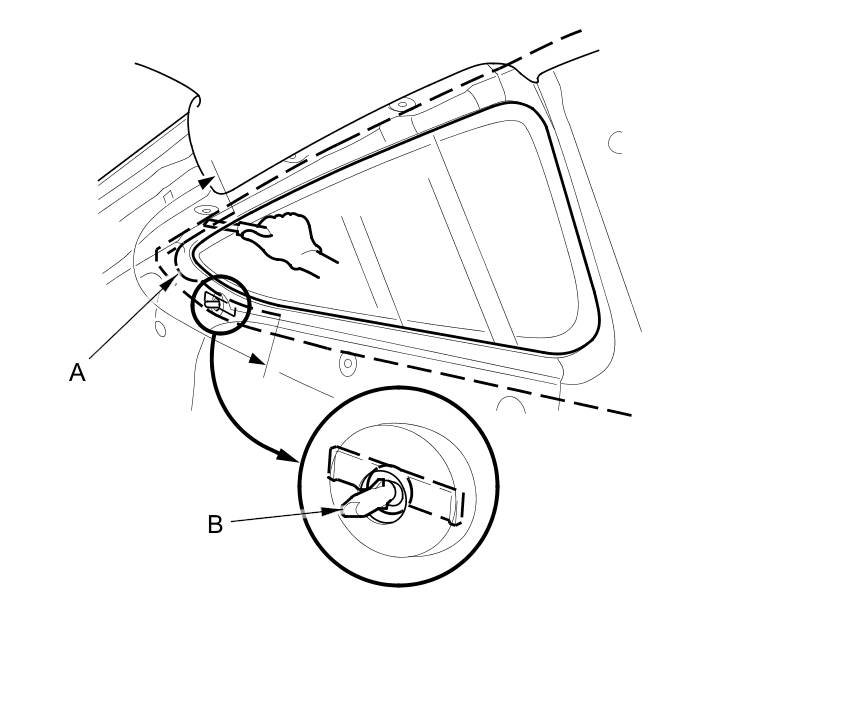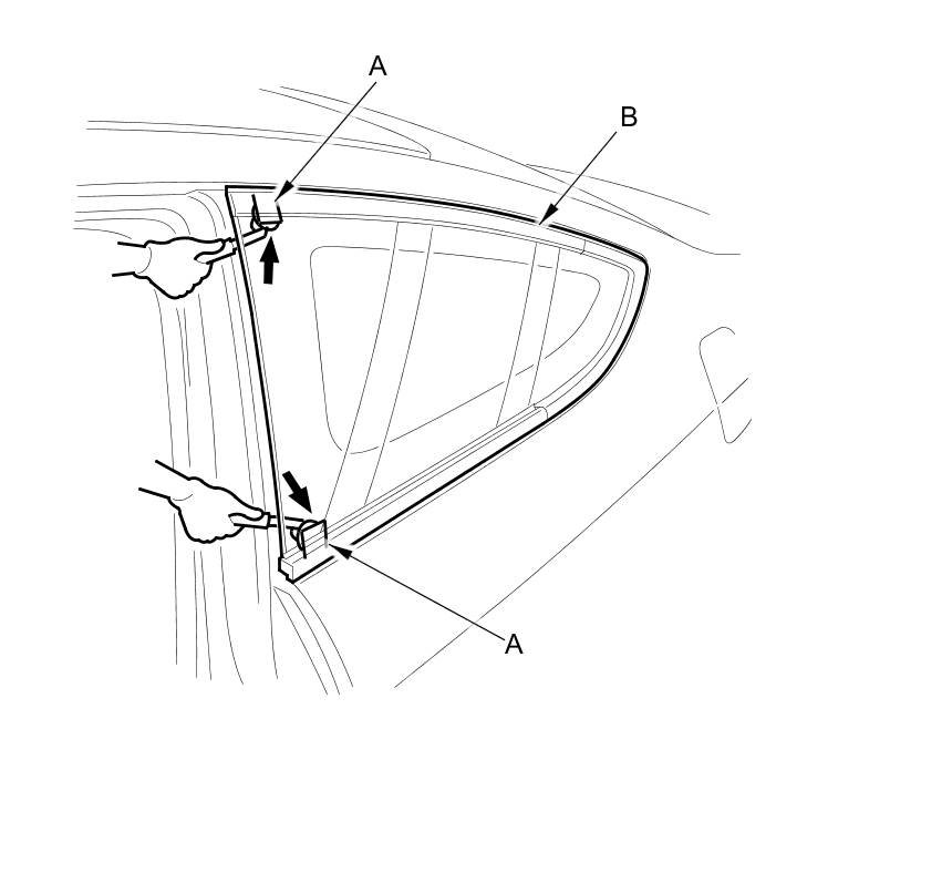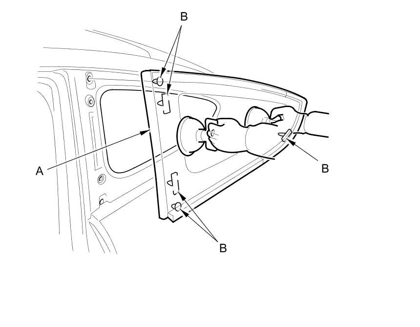 1. Hold the molding up on the quarter glass, and fit the hooks (B) of the molding to the edge of the rear corner first.