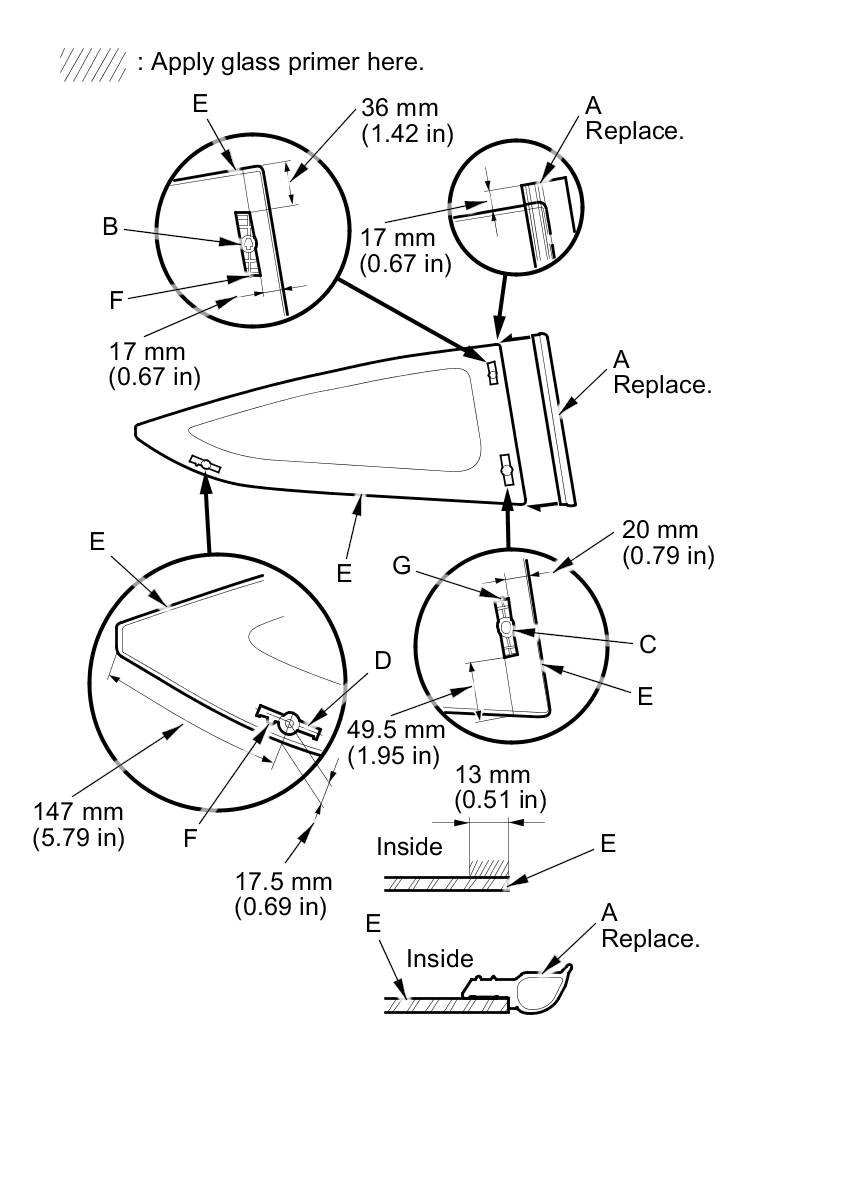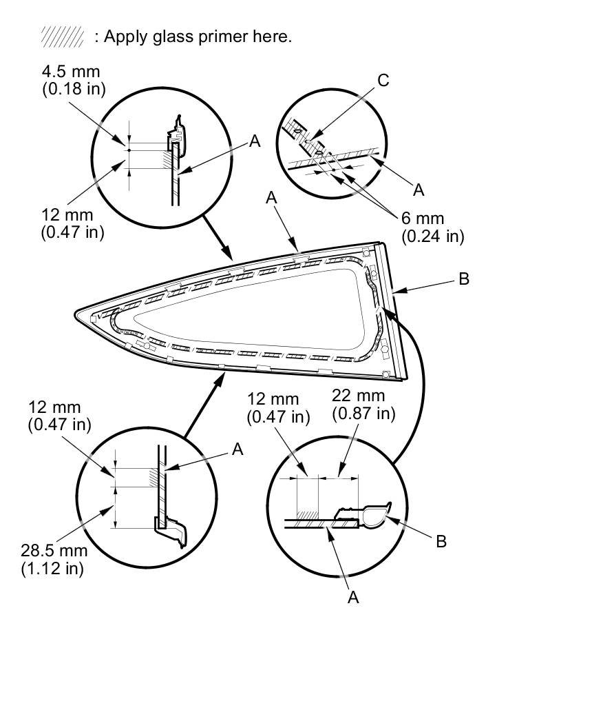 - Apply glass primer to the rear corner, upper corner and lower corner area of the quarter glass using the printed dots (C) on the quarter glass as a guide.