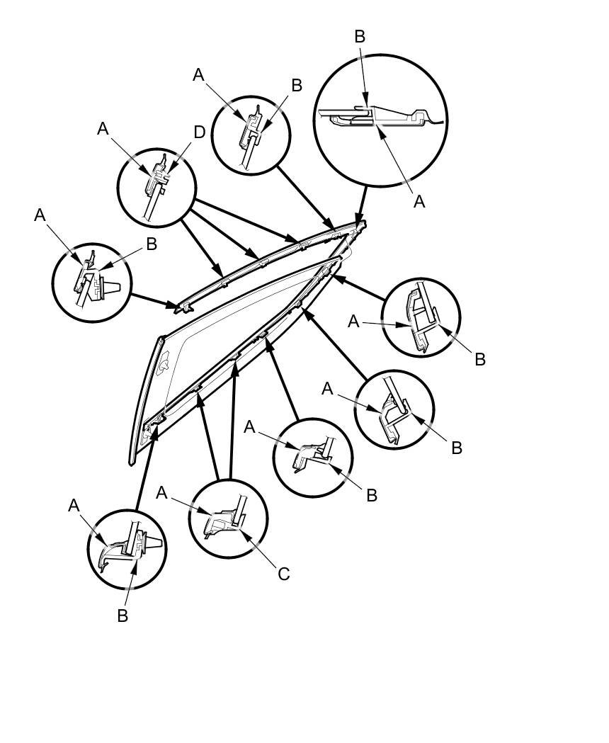 2. From the rear corner to the front, hook the lower clips (C) and the upper clips (D) of the molding to along the edges of the glass.