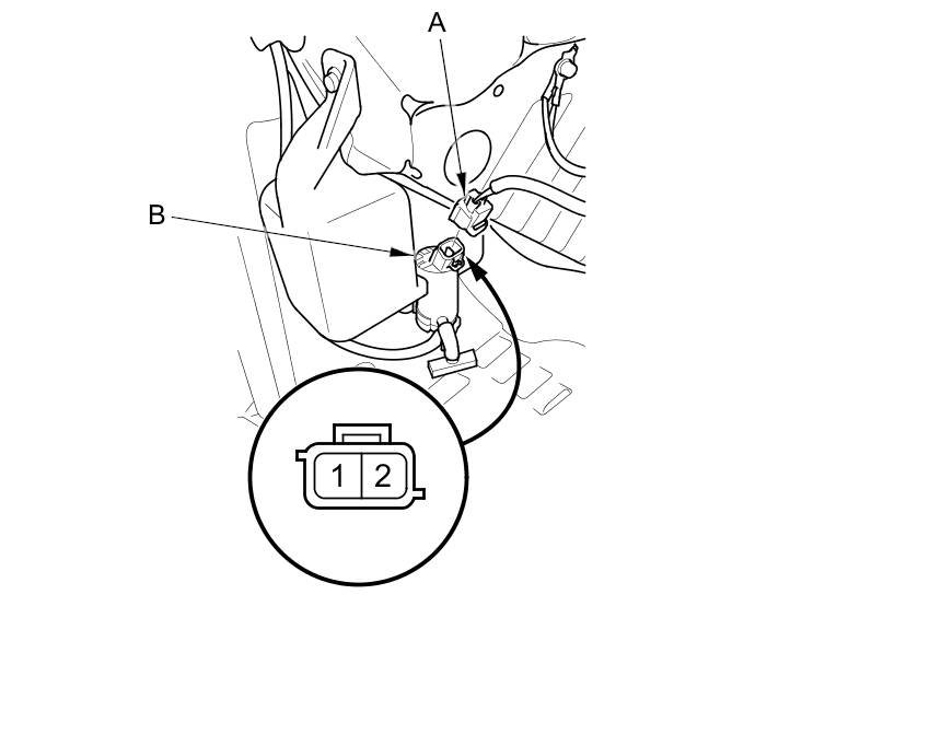 2. Disconnect the 2P connector (A) from the windshield washer motor (B).
