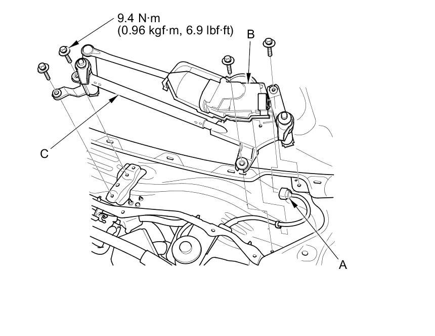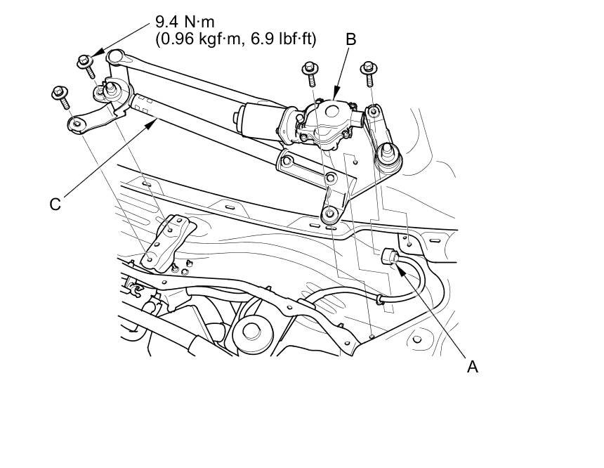 2. Install the wiper motor to the windshield wiper linkage assembly in the reverse order of removal.