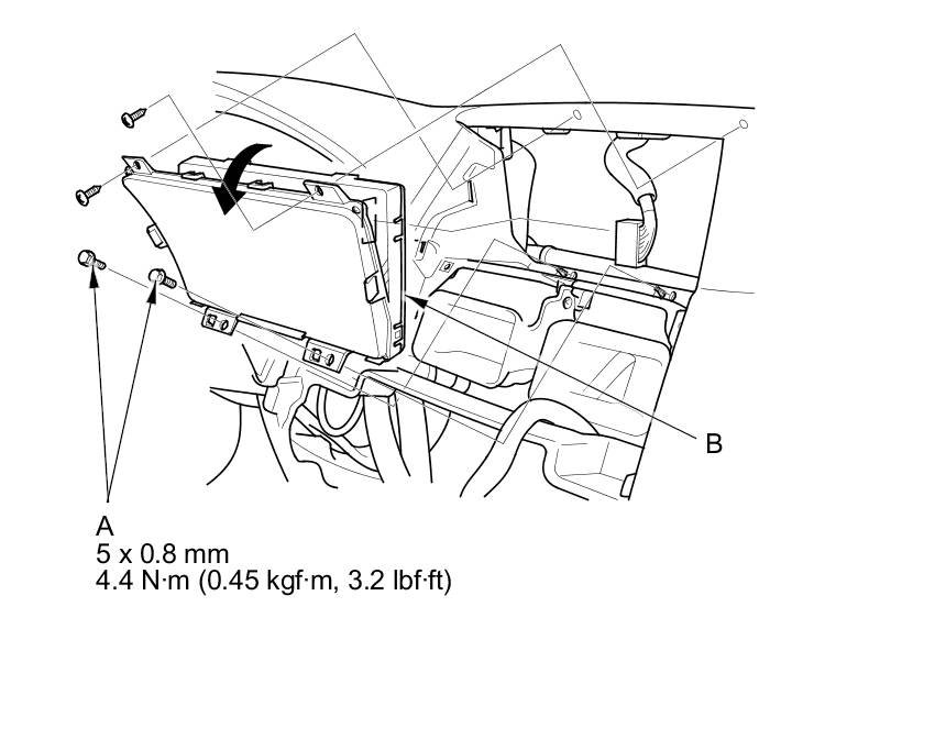 2. Remove the self-tapping screws and bolts (A), then pull out the navigation display unit (B).