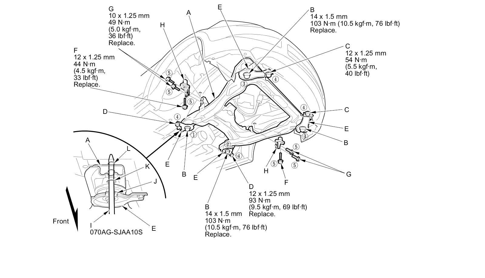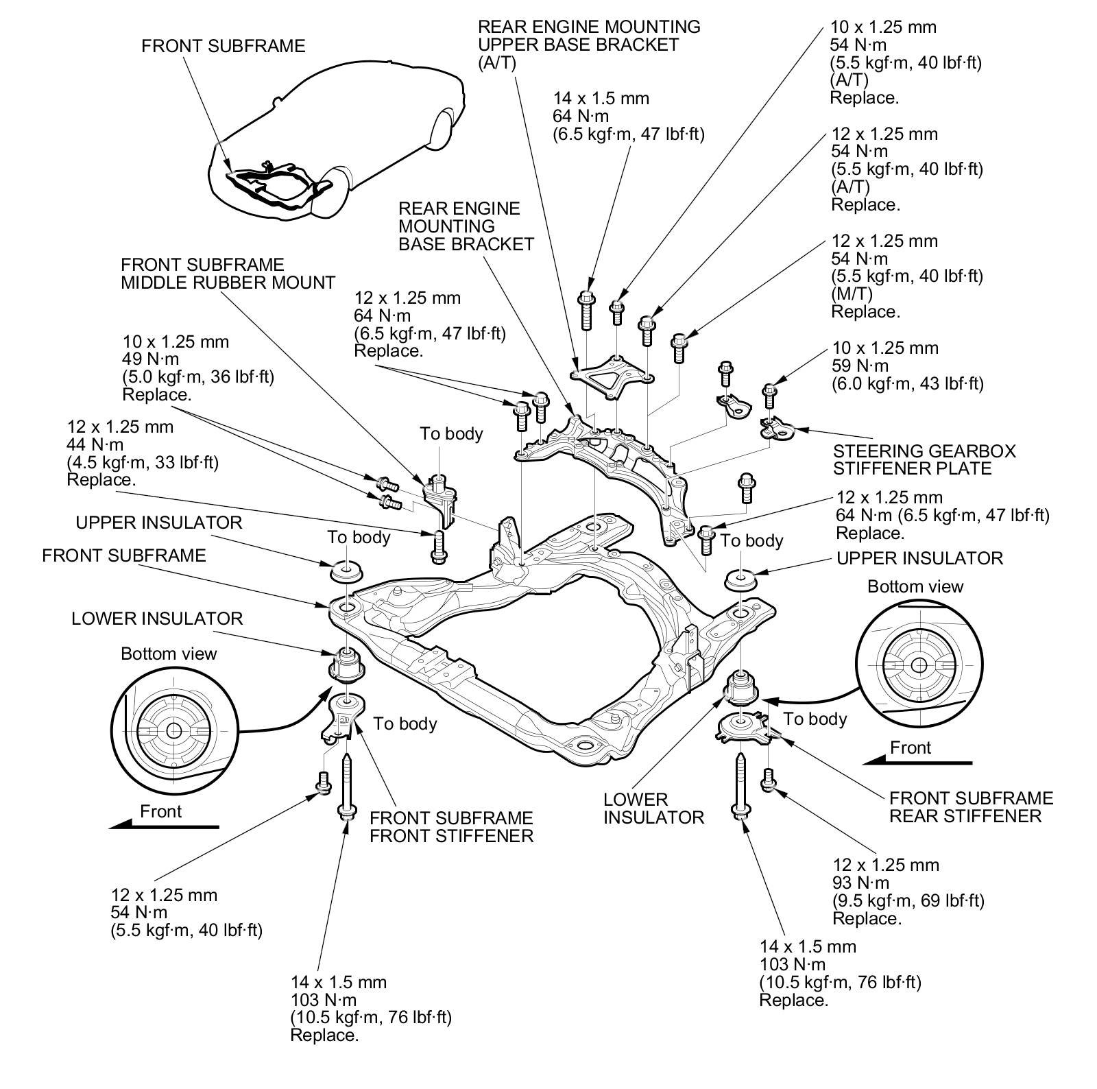 After removing the subframe mounting bolts, the front subframe middle rubber mount mounting bolts, the front subframe rear stiffener mounting bolts, the rear engine mounting base bracket mounting bolts, and the rear engine mounting upper base bracket mounting bolts (A/T), be sure to replace them with new ones.