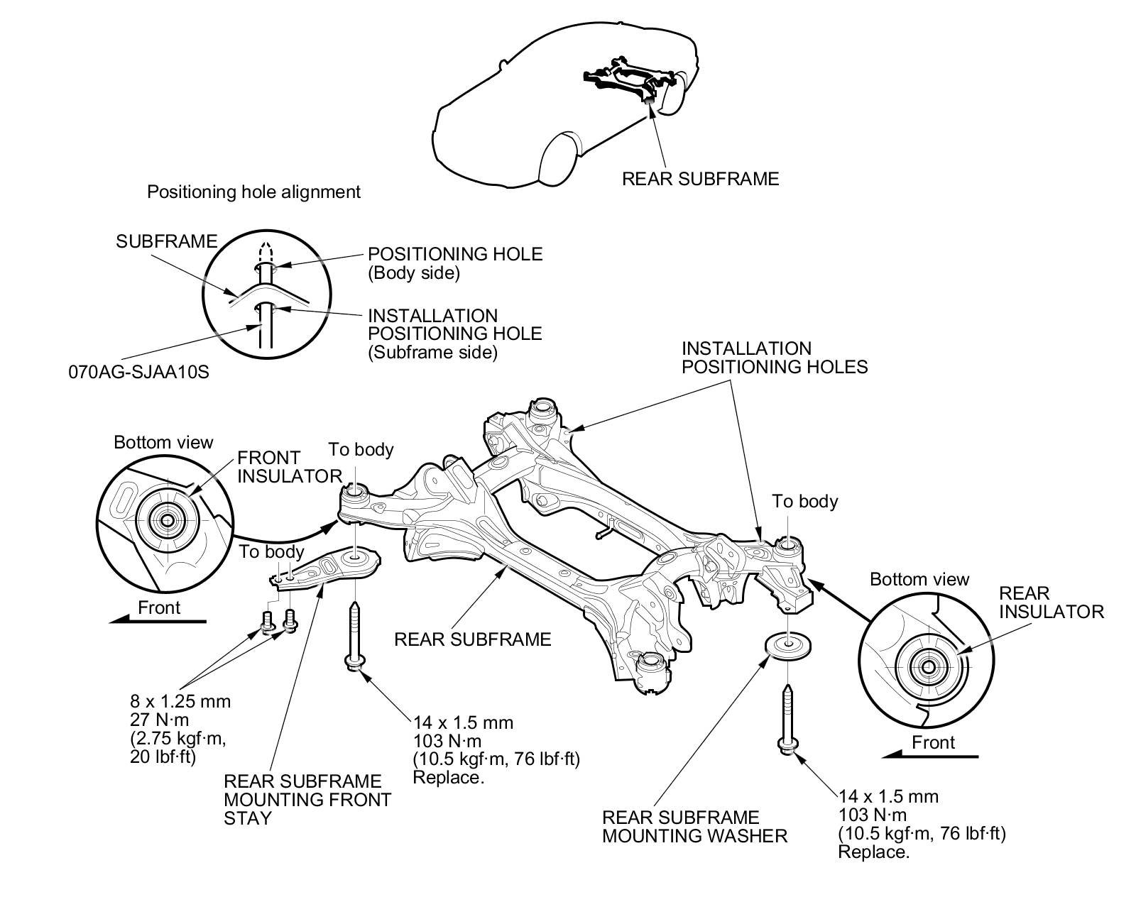 5. Tighten the subframe mounting bolts to the specified torque values starting with the right rear subframe mounting bolt. Use the subframe alignment pin when tightening the rear side subframe mounting bolts.