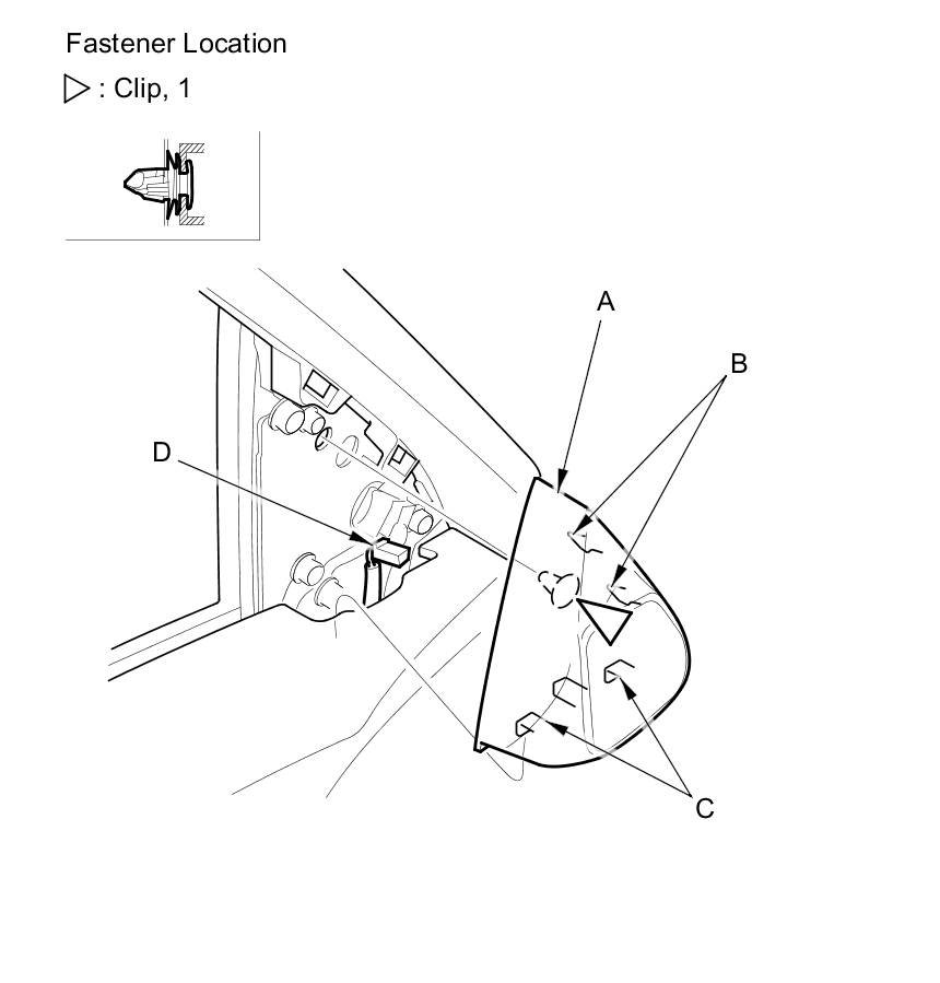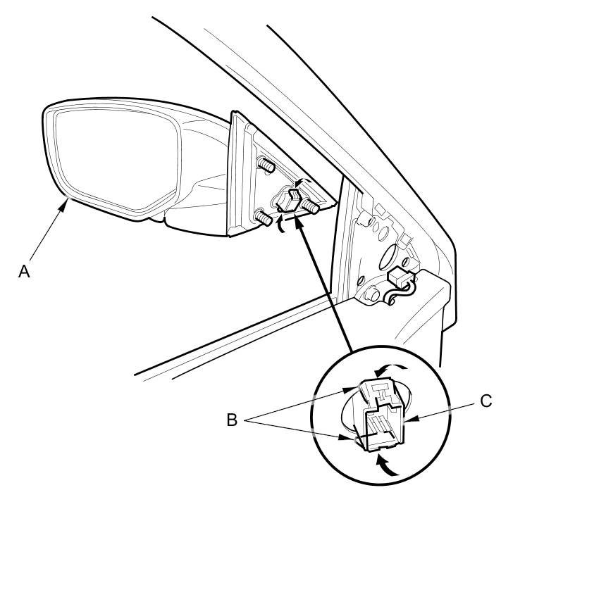 5. While holding the power mirror (A), squeeze the retaining tabs (B) on the connector clip (C), then push out to remove the power mirror.