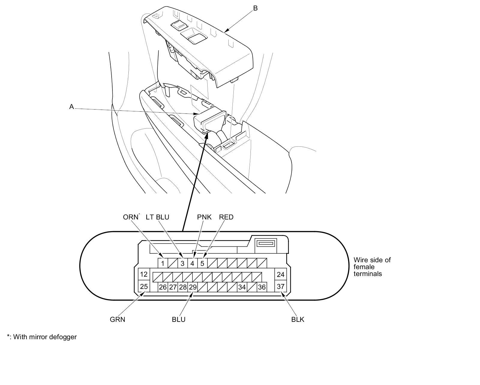 3. Disconnect the 37P connector (A) from the front passenger's power window switch (B).