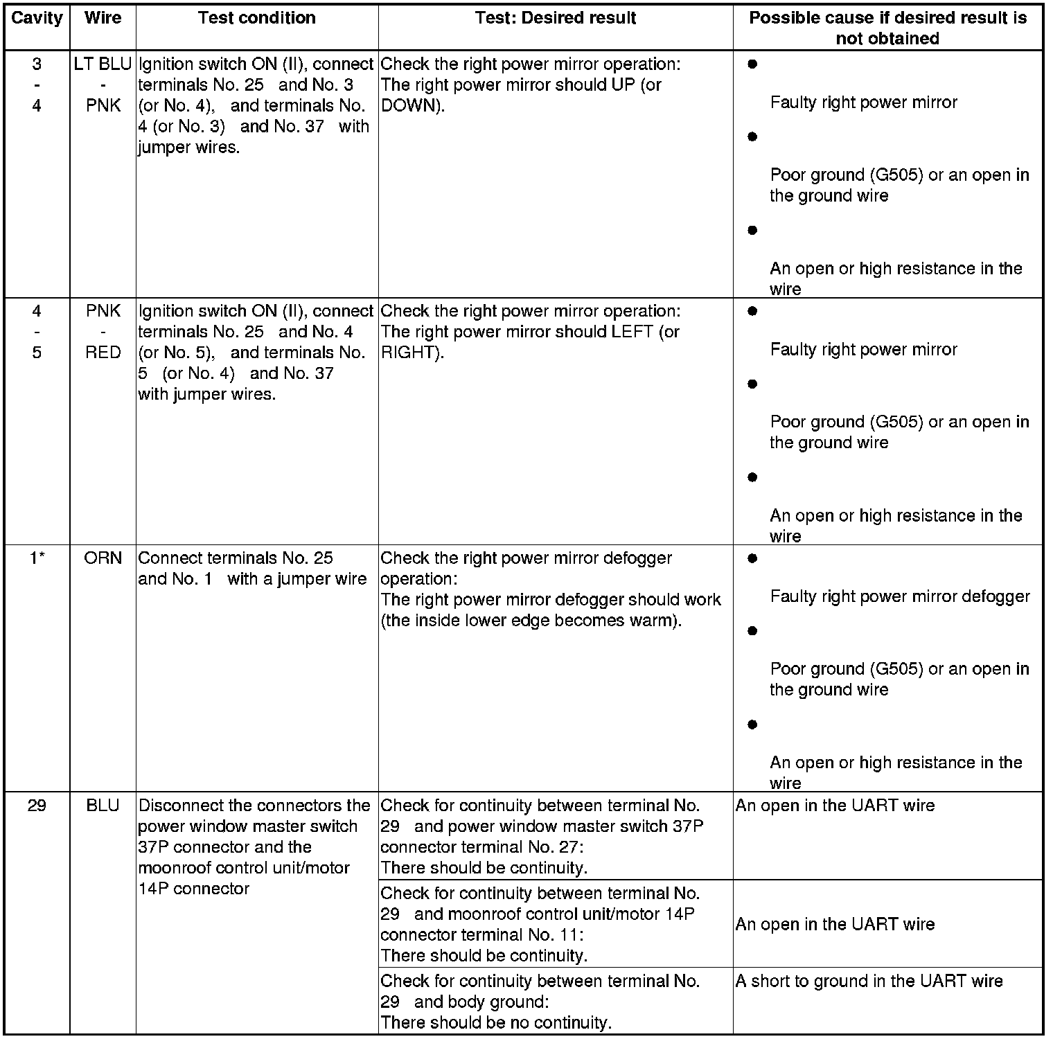 Power Mirrors (Front Passengers Power Window Switch) Input Test