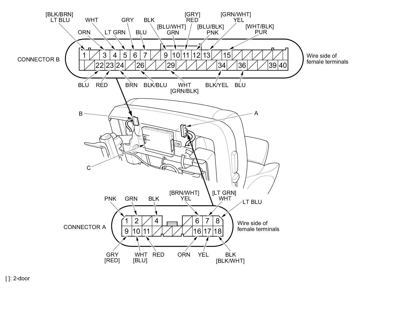 3. Disconnect the 40P connector (A) and 18P connector (B) from the power seat control unit (C).