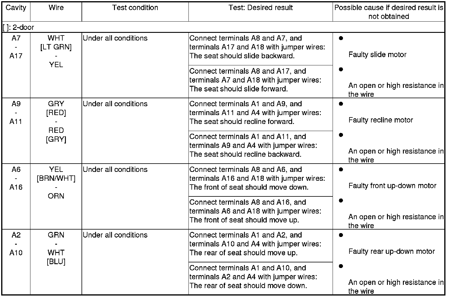 7. Disconnect the connectors from the power seat control unit, and do the following input tests: