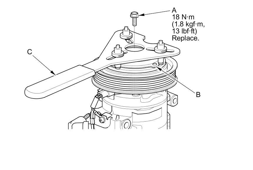 1. Remove the center bolt (A) while holding the pressure plate (B) with the A/C clutch holder (C).