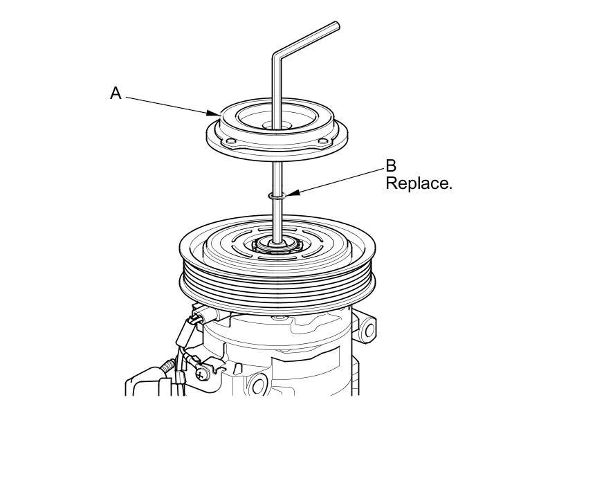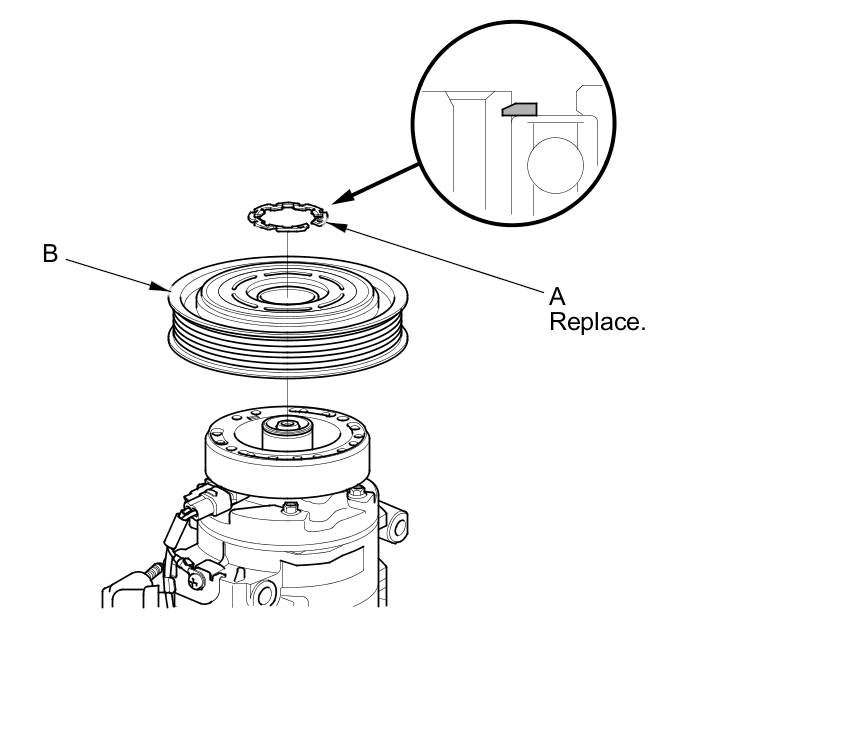 3. If you are replacing the field coil, remove the snap ring (A) with snap ring pliers, then remove the pulley (B). Be careful not to damage the pulley or the A/C compressor.