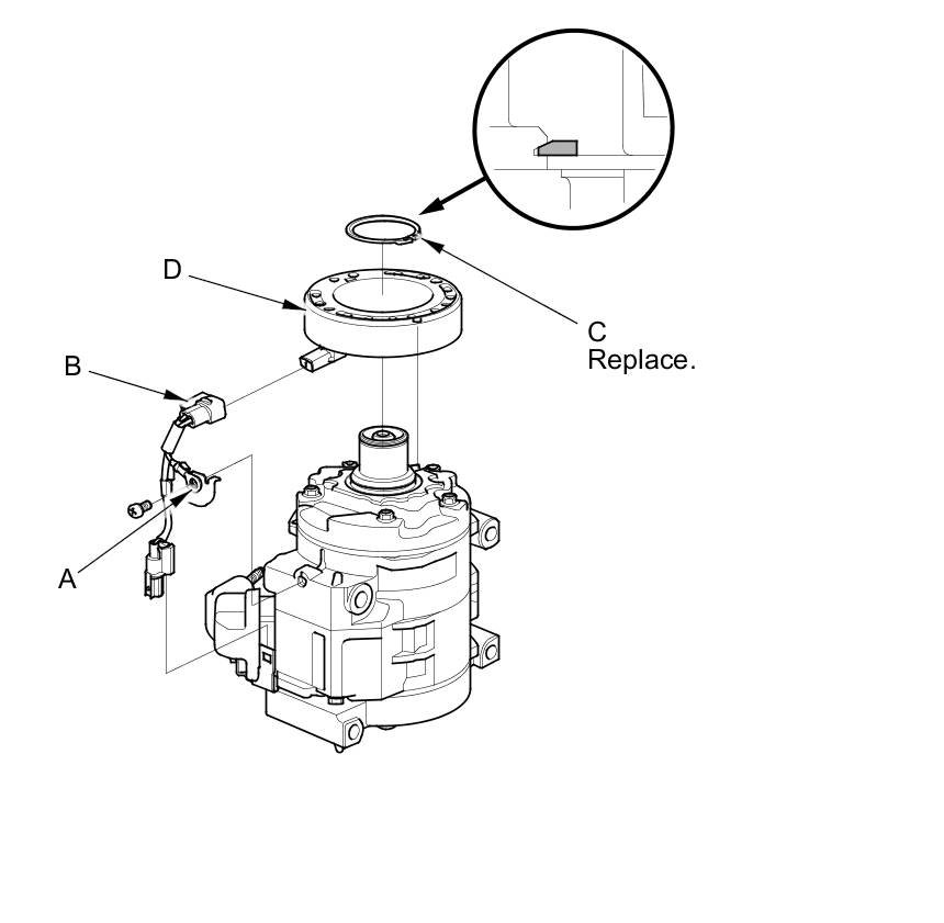 4. Remove the screw from the field coil ground terminal (A). Disconnect the connector (B) from the field coil, then remove the snap ring (C) with snap ring pliers, then remove the field coil (D). Be careful not to damage the field coil or the A/C compressor.