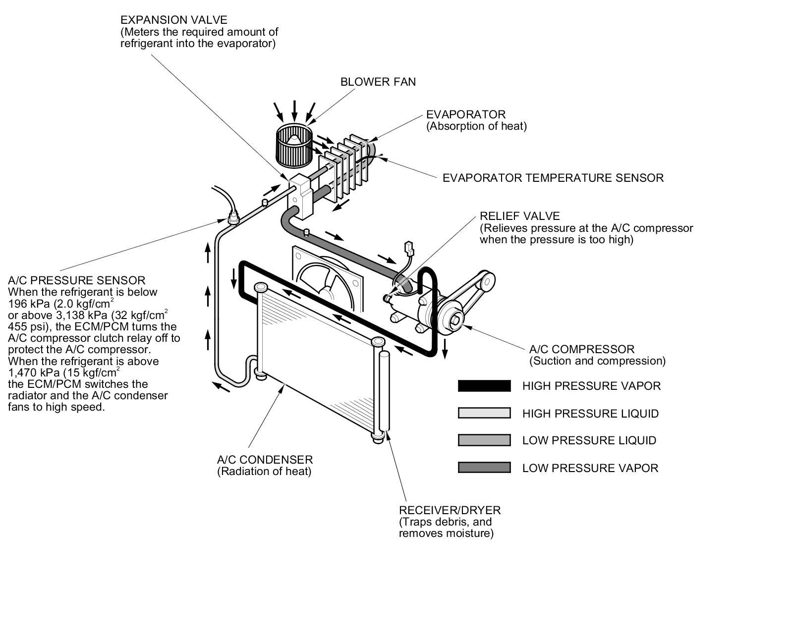 NOTE: When the refrigerant is below 196 kPa (2.0 kgf/cm2, 28 psi) or above 3,138 kPa (32 kgf/cm2, 455 psi), the ECM/PCM turns the A/C compressor clutch relay off to protect the A/C compressor. When the refrigerant pressure is above 1,470 kPa (15.0 kgf/cm2, 213 psi), the ECM/PCM switches the radiator and the A/C condenser fans to high speed.