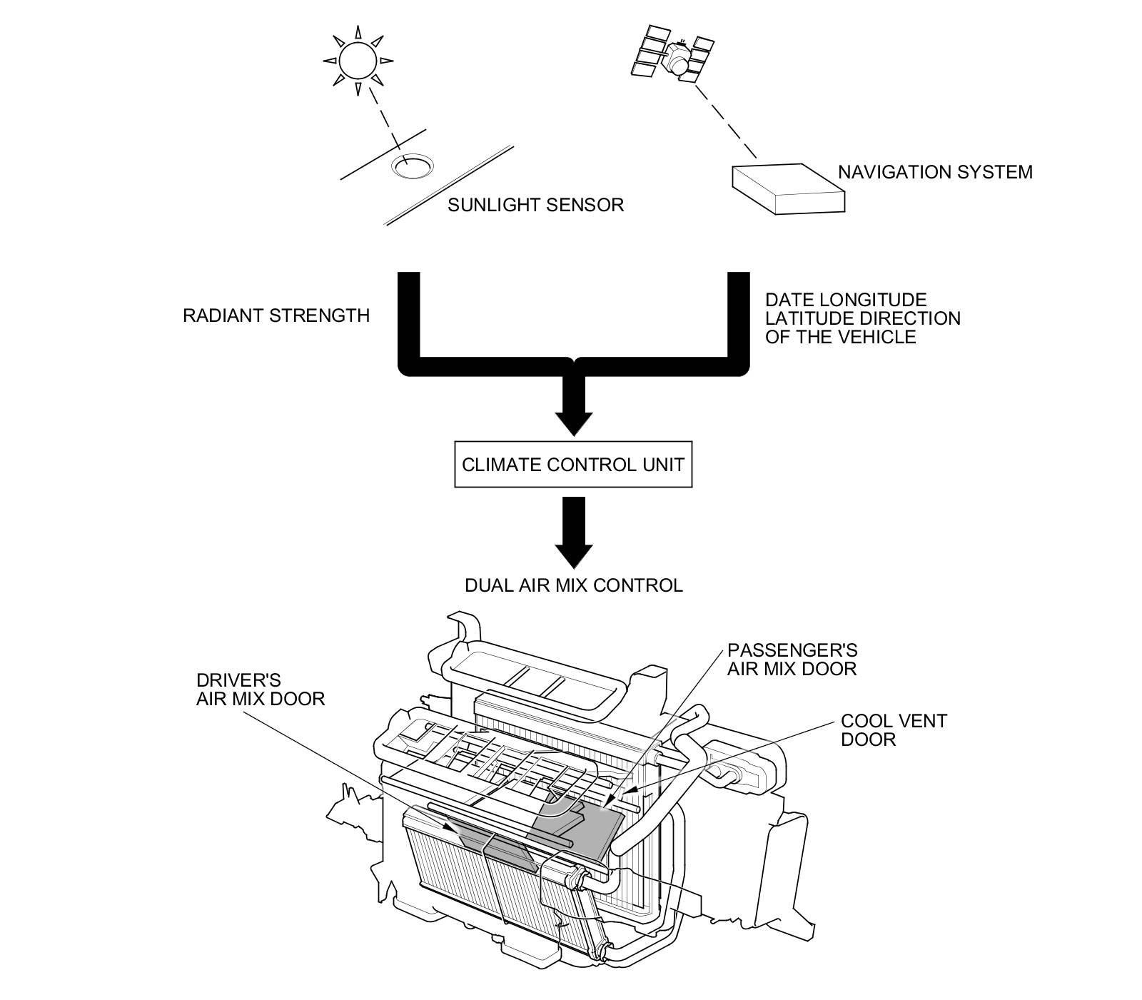 The i-Dual zone climate control system automatically controls the temperature and the air direction to the driver and passenger's side depending on the angle of the sun and the direction of the vehicle. It calculates information such as date, time, longitude, and latitude from the navigation system, as well as the radiant strength of the sun from the sunlight sensor, to determine the appropriate mode position and temperature to be directed to each side.