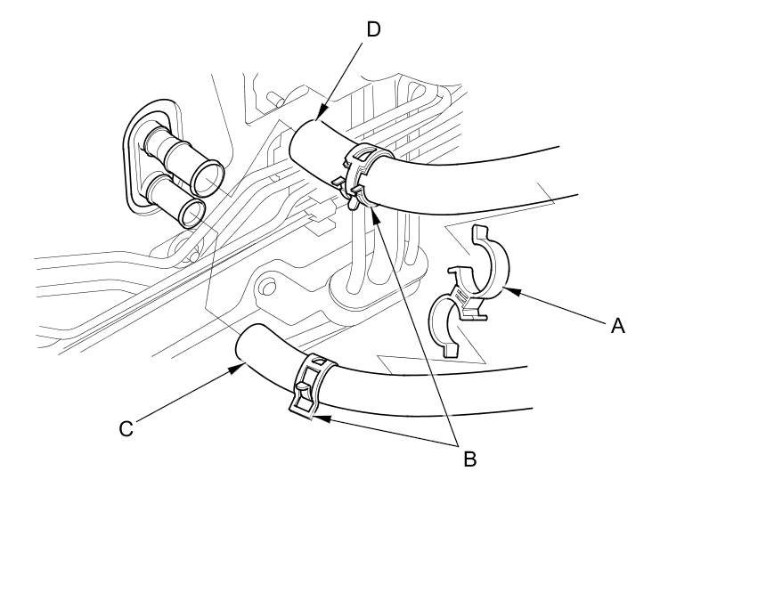 5. From under the hood, remove the clamp (A). Slide the hose clamps (B) back. Disconnect the inlet heater hose (C) and the outlet heater hose (D) from the heater unit. Note the layout of the hoses.
