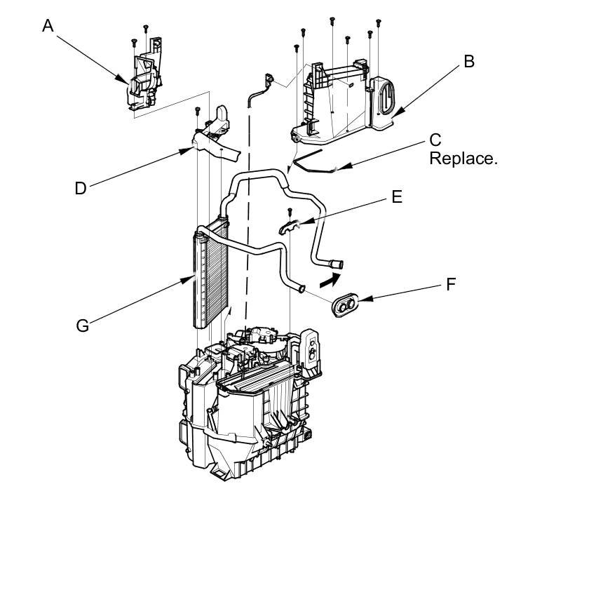 14. Remove the self-tapping screws, the heater pipe bracket (E), and the grommet (F), and carefully pull out the heater core (G).