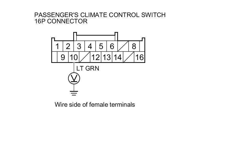 6. Measure the voltage between passenger's climate control switch 16P connector terminal No. 10 and body ground.