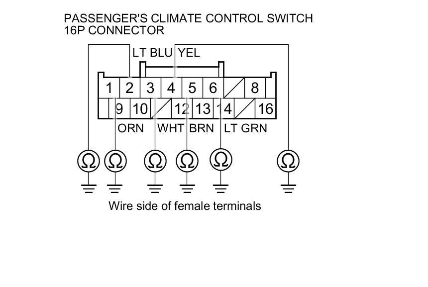 9. Check for continuity between the following terminals of the passenger's climate control switch 16P connector and the driver's climate control switch 16P connector.