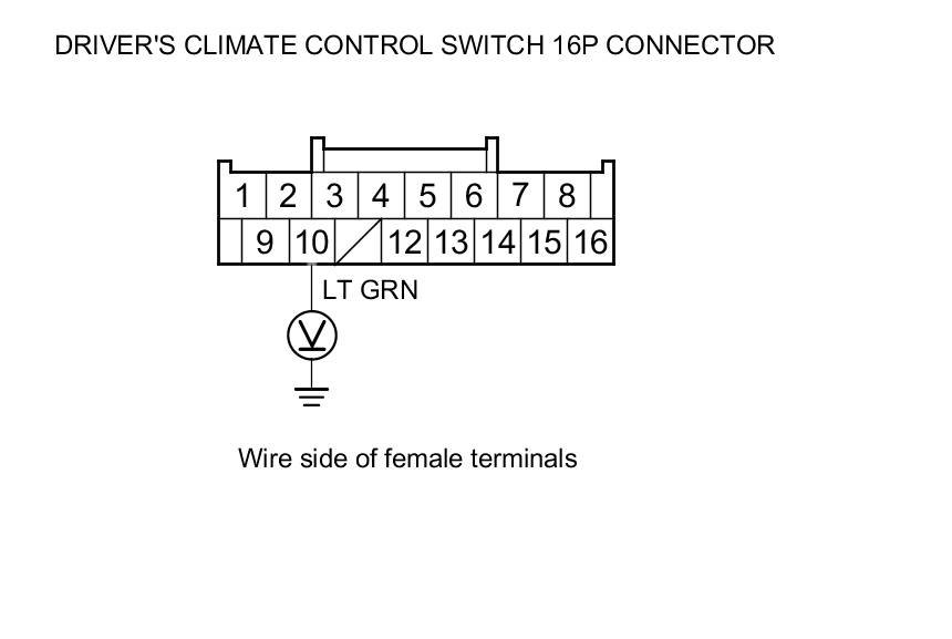 14. Measure the voltage between driver's climate control switch 16P connector terminal No. 10 and body ground.