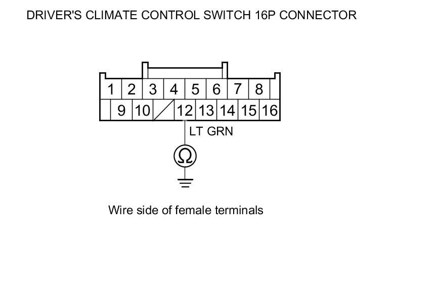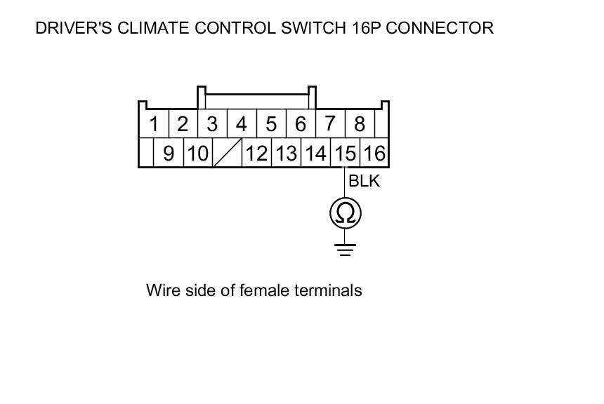 16. Check for continuity between driver's climate control switch 16P connector terminal No. 15 and body ground.
