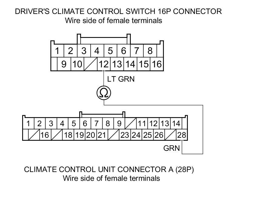 18. Check for continuity between driver's climate control switch 16P connector terminal No. 12 and climate control unit connector A (28P) terminal No. 28.