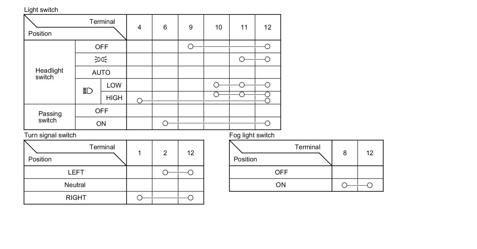 6. Check for continuity between the terminals in each switch position according to the tables.