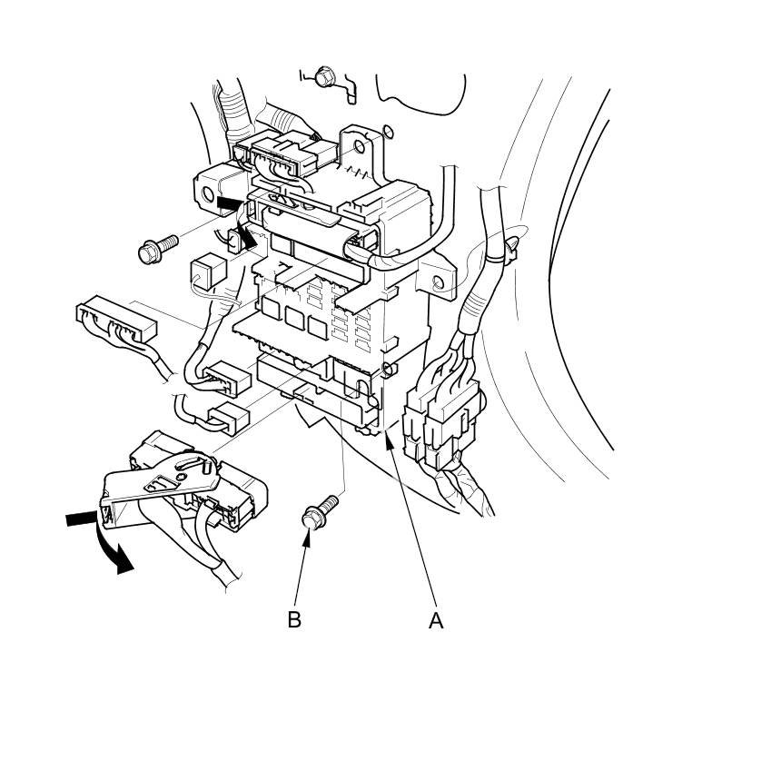 5. Remove the mounting bolt from the upper side of passenger's under-dash fuse/relay box, and remove the passenger's under-dash fuse/relay box.